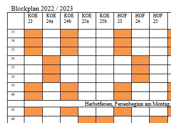 Hier finden Sie die aktuellen Blockpläne der Abteilung Abteilung Gastronomie Nahrung und Körperpflege. Blockplan 2025/2026 mit dem Stand vom 12.09.2025 Blockplan 2026/2027 mit dem Stand vom 11.12.2025